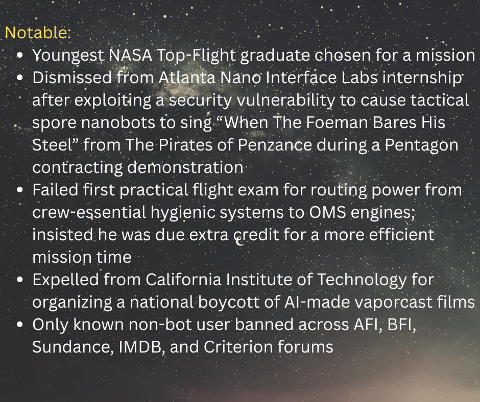 When Earth’s Carbon Cycle has stalled, the 3-person crew of the SS Resurrection is tasked with a last-ditch attempt to save humanity by traveling to the Saturn Space Station on Titan for precious hydrocarbons. Commander Crimson Fields, Mission Specialist Megan Riley, and Mission Specialist Nathan Baskin must juggle mission mishaps and crew tensions to get the job done. During their planned two-year mission, the Resurrection endures several debris hits and AI malfunctions threatening their safety and the mission.